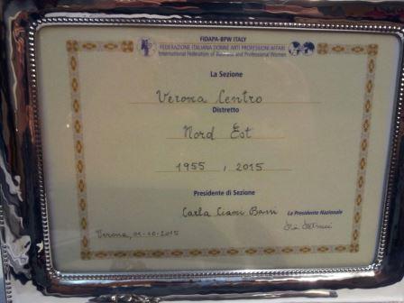 targaUna cerimonia emozionante, tenutasi 8 maggio 2015, al Circolo Ufficiali Castelvecchio di Verona, ha  ricordato i 60 anni di attività della Sezione Verona Centro e ha sancito solennemente il suo impegno per futuro.