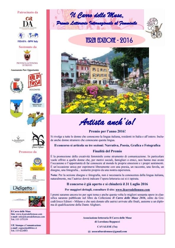 Il Premio letterario “Il carro delle muse”, patrocinato dalla Sezione di Bolzano è un premio per sole donne, di qualsiasi età e nazionalità, purché conoscano la lingua italiana.