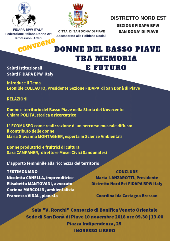 Il giorno 10 novembre 2018 nella Sala “V. Ronchi” della sede del Consorzio di Bonifica in Piazza Indipendenza, 25 a San Donà di Piave, la locale Sezione FIDAPA BPW ITALY (Federazione Italiana Donne Arti Professioni Affari) organizza un Convegno dal titolo” DONNE DEL BASSO PIAVE TRA MEMORIA E FUTURO”.