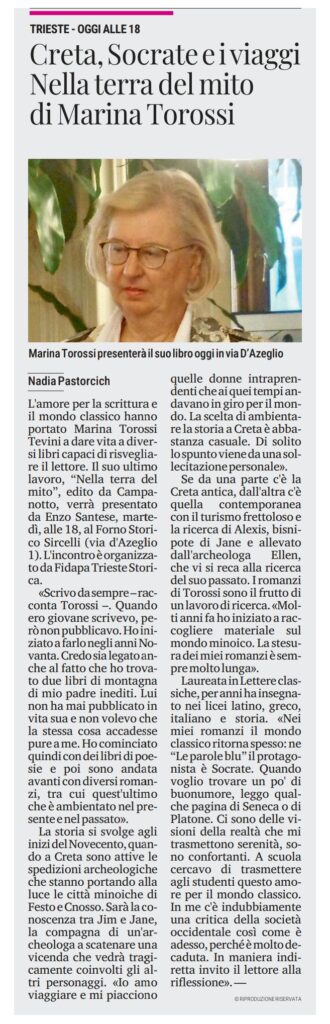 Martedรฌ 7 aprile 2026 alle ore 18:00 presso il Forno Storico Sircelli, la scrittrice Marina Torossi Tevini presenterร il suo romanzo “Nella terra del mito” con il commento critico di Enzo Santese.