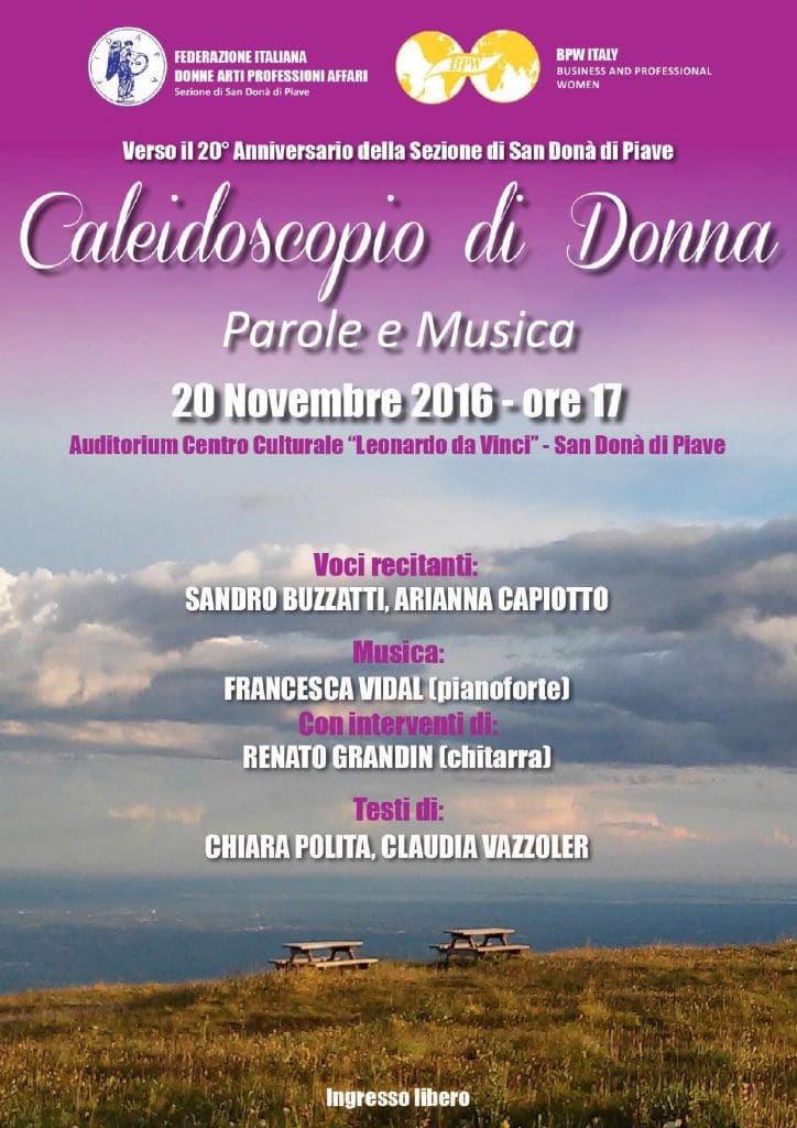 Quattro temi per altrettante riflessioni: le parole delle donne, gli occhi che fanno innamorare, la violenza, gesti e parole, più forti del dolore, come amano le donne. Arianna Capiotto e Sandro Buzzatti si alternano in un gioco di voci e di atmosfere che interagiscono con Francesca Vidal al pianoforte e Renato Grandin alla chitarra, attraverso i testi in prosa e poesia di due scrittrici sandonatesi e socie Fidapa: Chiara Polita e Claudia Vazzoler.