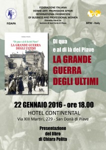 Il 22 Gennaio 2016, alle ore 18 presso l’Hotel Continental , la Sezione di San Donà di Piave – F.I.D.A.P.A. – BPW ITALY presenta il libro di Chiara Polita “Di qua e al di là del Piave – La Grande Guerra degli ultimi” edito da Mazzanti Libri, un intenso lavoro di oltre 350 pagine con una ricca documentazione iconografica da originali della collezioni dell’autrice: fotografie, cartoline, libri, giornali e documenti d’epoca relativi alla storia del territorio, collezionati dai tempi dell’Università e che ancora ad oggi costituiscono motivo di ricerca per la studiosa.
