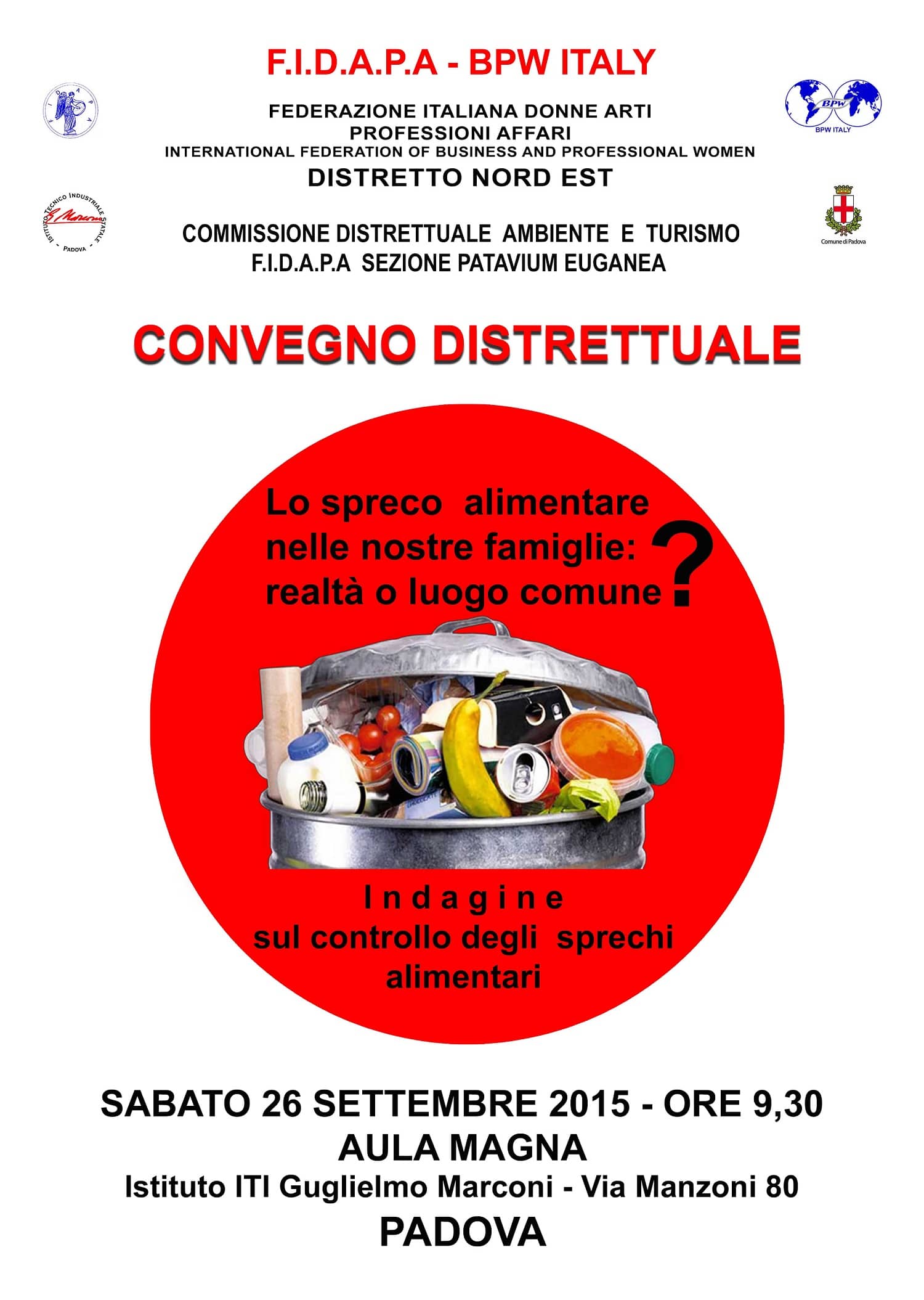 Locandina 2015 FIDAPAinvito finito (1)Invitiamo le Socie a partecipare al convegno distrettuale organizzato a cura della Commissione Ambiente e Turismo, Responsabile distrettuale Carla Ciani Bassi,  con il supporto organizzativo e logistico della Sezione Patavium Euganea e della sua Presidente Franca Coi Romagnoli.