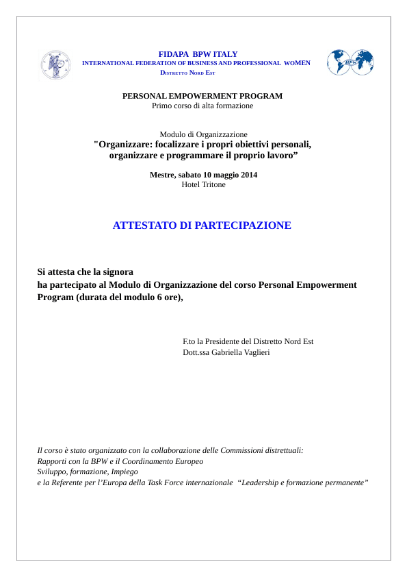 Il corso è tenuto dalla dott.ssa Anna Cargnello che ha partecipato al primo corso PEP per formatori, organizzato a livello europeo dalla BPW nel 2013 in Germania, acquisendo il titolo di “trainer” del PEP della BPW. Per rendere il corso più fruibile è stato suddiviso in 3 moduli di 6 ore ciascuno. I moduli sono complementari fra loro, ma possono essere frequentati anche singolarmente. L’iscrizione per il 1 modulo termina il 30 aprile.