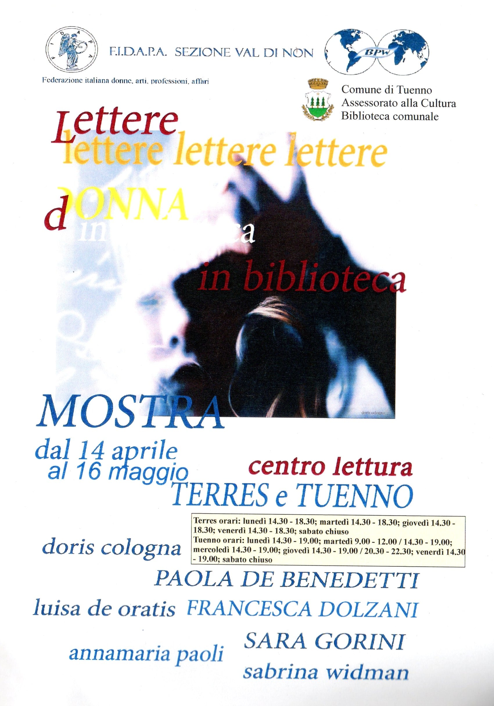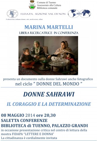 Nella biblioteca di Tuenno, Palazzo Grandi, giovedì 8 maggio 2014,  ore 20:30,  FIDAPA (Federazione Italiana  Donne Arti Professioni Affari) Sezione Val Di Non, organizza un incontro-reportage sulle donne del deserto, le donne del Saharawi, un popolo povero ma non misero di donne forti, non potenti, che vive in un ambiente inospitale e senza risorse con grandissima dignità ed organizzazione.