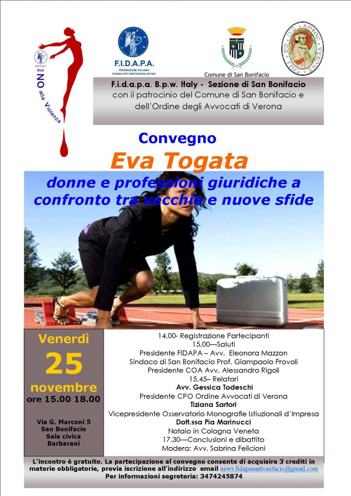 La Fidapa BPW Italy sezione di San Bonifacio con il patrocinio dell’Ordine degli Avvocati di Verona e del Comune di San Bonifacio organizza in sala civica barbarani per il giorno 25 novembre 2016, dalle ore 15.00 alle 18.00, un convegno per la formazione continua degli Avvocati dedicato all’evoluzione della figura femminile nelle professioni giuridiche, nella giornata dedicata al contrasto della violenza contro le donne. In questa giornata si è scelto di dare voce alle professioniste del diritto perchè in numero crescente, si appassionano alle vicende umane dei propri assistiti, riescono a compenetrarsi nei problemi, sono spesso più preparate e determinate dei colleghi maschi: eppure, quello delle donne nell’avvocatura è un percorso ancora tutto in divenire, che paga lo scotto di secoli di arretratezza culturale.Eppure per tanti versi la donna non era estranea al mondo del diritto. Anzi, ne faceva parte integrante, tale da esserne addirittura il simbolo: Temi, moglie di Zeus, simboleggiava l’ordine e il diritto; sua figlia Dike, simboleggiava la giustizia, il principio fondamentale alla base della società civile. Non è un caso che uno dei personaggi più complessi e coraggiosi della tragedia greca sia proprio una donna, Antigone che sfida la legge, quella dello Stato, in virtù di una legge etica.