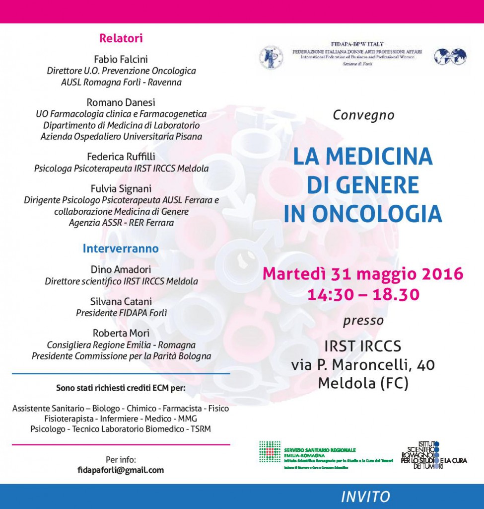 Il  Convegno sulla MEDICINA DI GENERE IN ONCOLOGIA, che si terrà il 31 maggio p.v., presso la Sala Convegni dell’IRST di Meldola (FC) e organizzato da FIDAPA, Sezione di Forlì, in collaborazione con l’IRST-IRCCS (Istituto Scientifico Romagnolo per lo Studio e la Cura dei Tumori) e l’AUSL della Romagna, è un’ iniziativa che fa parte del programma FIDAPA 2015-2017, 1° annualità , conclude il percorso sull’argomento Medicina di Genere (nuova dimensione trasversale intraspecialità della medicina che studia l’influenza del sesso e del genere sulla fisiologia,fisiopatologia e patologia umana), iniziato nel 2014 con il convegno: MEDICINA DI GENERE: UNA NUOVA FRONTIERA …al quale ha fatto seguito nel 2015, LA MEDICINA DI GENERE NELLE PATOLOGIE CARDIOVASCOLARI: solo domande o già qualche risposta?