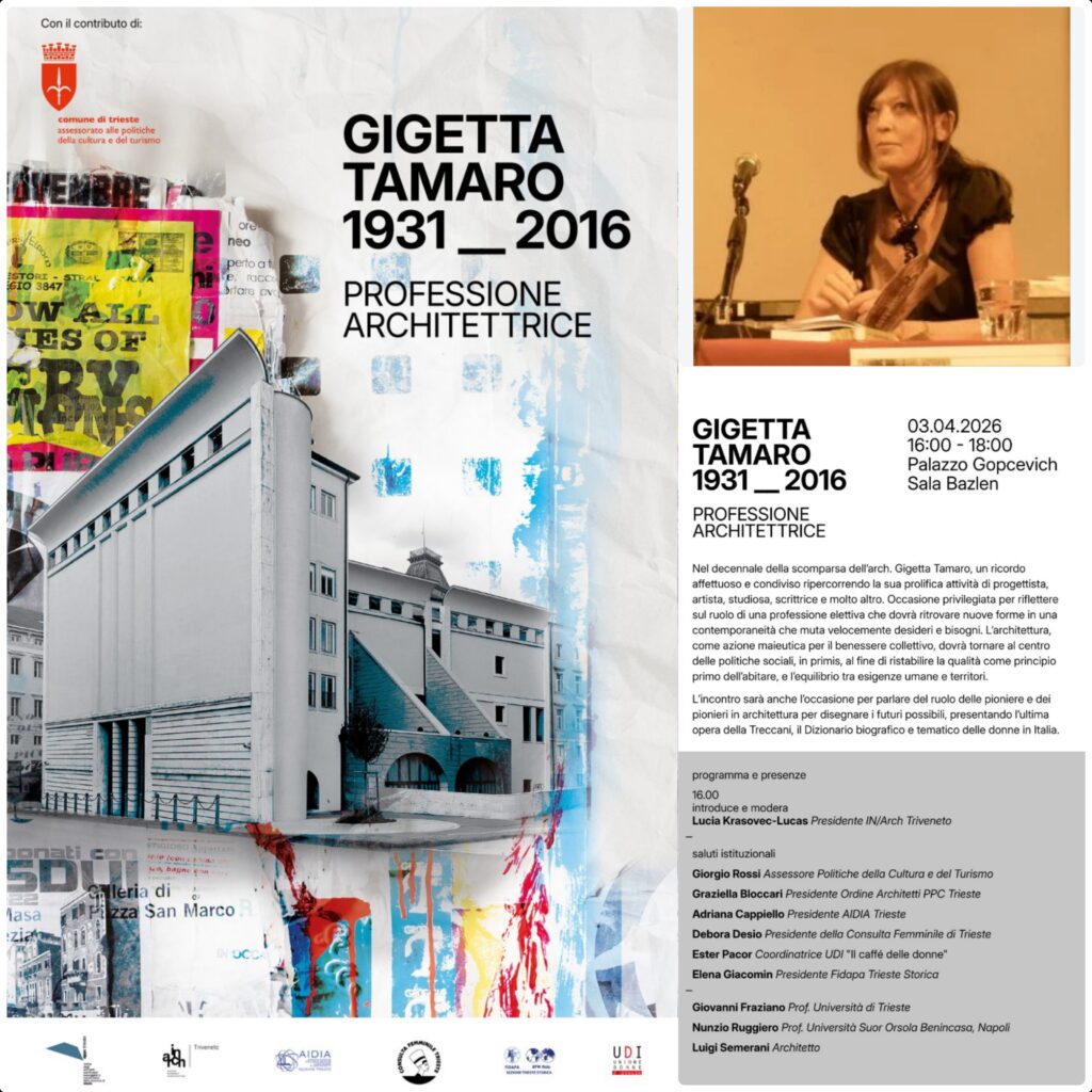 In data 03 aprile 2026, alle ore 16:00 presso la sala Blazen di Palazzo Gopcevich la Presidente IN/Arch Triveneto Lucia Krasovec-Lucas, socia della Sezione Fidapa BPW Italy Trieste Storica di cui è stata Presidente per il biennio 2023-2025 e Responsabile della Task Force Nazionale Turismo e Cultura per il biennio 2025-2027, ricorda la figura e la prolifica attività di progettista, artista, studiosa, scrittrice e molto altro dell’architettrice Gigetta Tamaro nel decennale della sua scomparsa. L’incontro, collegandosi al tema intrenazionale BPW 2024/2027 “Ispirare, Innovare, Potenziare, Trasformare: insieme, Plasmiamo un Futuro sostenibile” sarà inoltre l’occasione per parlare del ruolo delle pioniere e dei pionieri in architettura, e presentare l’ultima opera della Treccani, il Dizionario biografico e tematico delle donne in Italia.