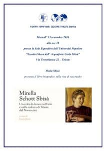 Ninvito-presentazione-libro-mirella-schott-sbisa_001el Novecento a Trieste l’attività culturale femminile ha avuto una grande rilevanza: l’apporto di donne artiste, scrittrici e studiose è stato documentato finora solo parzialmente. Questo libro di Paola Sbisà  è una biografia sulla vita di sua madre, basata sulla narrazione diretta alla figlia e su testimonianze che ci fanno rivivere storie di famiglia e percorsi artistici in un secolo ricco di sollecitazioni e cambiamenti. Si nota che le figure femminili sono fondamentali e, come testimoniato da studi sociologici e storici, nella città di Trieste le donne sono state protagoniste della vita culturale di una città tutta particolare.