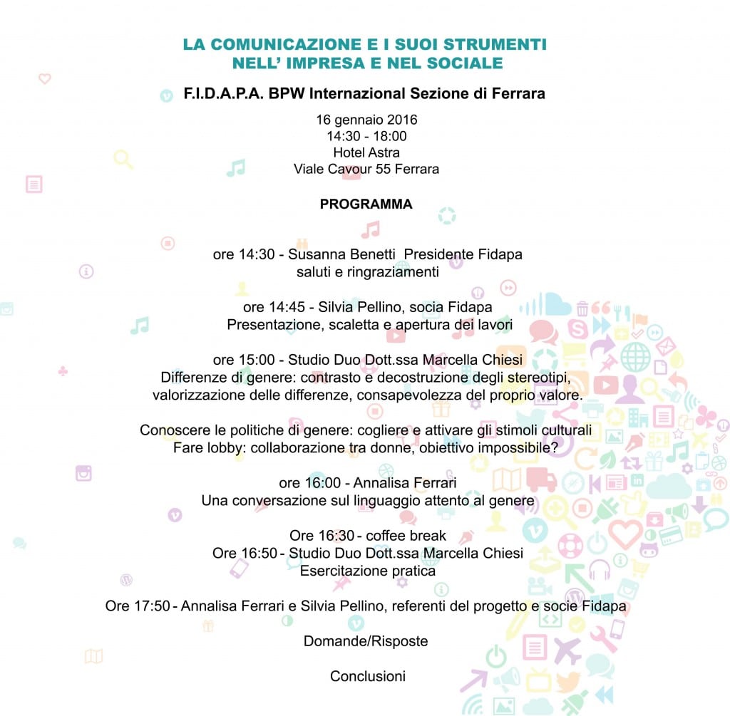 Sabato 16 gennaio dalle 14,30 alle 18,00 all’Hotel Astra la Sezione di Ferrara di F.I.D.A.P.A BPW Italy promuove in tre fasi distinte, un percorso progettuale relativo alla comunicazione: