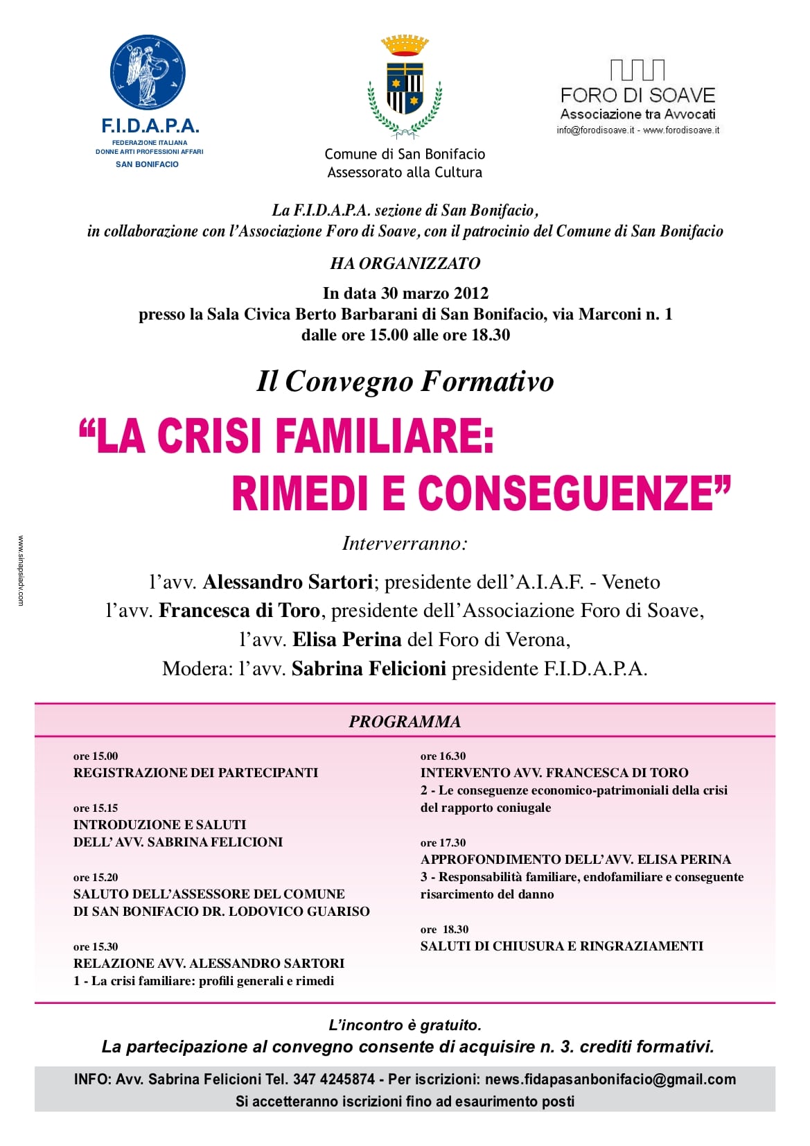 La F.I.D.A.P.A. sezione di San Bonifacio, presieduta dall’avv. Sabrina Felicioni, in collaborazione con con l’Associazione Foro di Soave, presieduta dall’avv. Francesca di Toro, con il patrocinio del Comune di San Bonifacio ha organizzato in data 30 marzo 2012 presso la sala civica Berto Barbarani dalle ore 15 alle ore 18.30 l’evento formativo dal titolo: la crisi familiare: rimedi e conseguenze. Inerverranno l’avv. Alessandro Sartori, presidente dell’A.I.A.F. – VENETO, l’avv. Francesca di Toro, l’avv. Elisa Perina. I lavori inizieranno con l’analisi delle nozioni essenziali del matrimonio come negozio giuridico, con particolare attenzione al matrimonio putativo, simulato ed alla convivenza more uxorio. Seguirà una breve ricognizione degli istituti della separazione e divorzio con particolare attenzione al diritto al mantenimento ed agli alimenti sia sul profilo fiscale che previdenziale. Concluderà l’incontro un approfondimentosul rapporto tra  violazione dei doveri coniugali e responsabilità ex art. 2043 c.c.. L’Ordine degli Avvocati di Verona ha riconosciuto n. 3 crediti formativi per la formazione continua degli avvocati. L’ingresso è gratuito, previa iscrizione. Si accetteranno iscrizioni fino all’esaurimento dei posti disponibili.