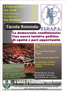 San Bonifacio: Il 2 Febbraio alle 10, si terrà in sala Barbarani a San Bonifacio, il primo match politico tra donne candidate alle prossime elezioni. A questo importante appuntamento intitolato “La democrazia condizionata: Una nuova incisiva politica di equità e pari opportunità” saranno presenti e graditissime ospiti della Fidapa di San Bonifacio, la Sen. Anna Cinzia Bonfrisco  del PDL, On. Giovanna Negro  per la Lega Nord, Dr.ssa Alessia Rotta per il PD e la Dr.ssa Maria Cristina Sandrin  della lista Donne per l’Italia, a contendersi l’attenzione sui rispettivi programmi politici che stanno portando in campagna elettorale.
