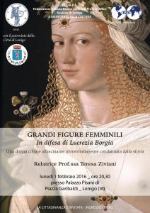 Il giorno 1 febbraio 2016, presso Palazzo Pisani, Piazza Garibaldi a Lonigo, la Prof.ssa Teresa Ziviani parlerà sul Tema Grandi figure femminili : “In difesa di Lucrezia Borgia”