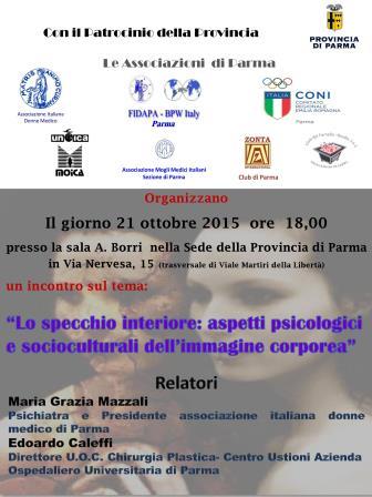 specchio interiorewebFIDAPA BPW IOTALY Sezione di Parma organizza, in collaborazione con le Associazioni cittadine, l’incontro: “Lo specchio interiore: aspetti psicologici e socioculturali dell’immagine corporea”, che si terrà il 21 ottobre 2015, alle ore 18:00, presso la sede della Provincia di Parma, in Via Nervesa 15 – Sala A. Borri.