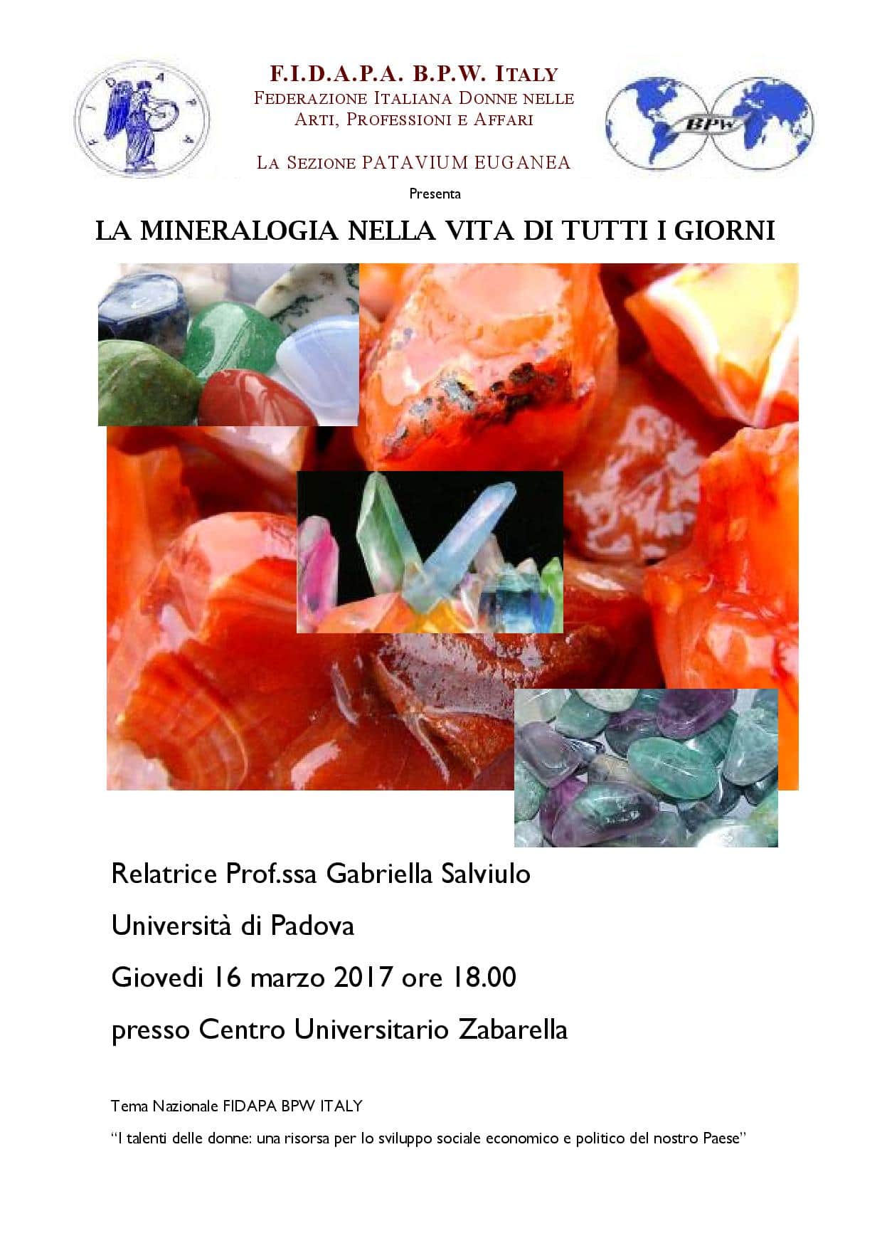 La relatrice è la professoressa Gabriella Salviulo, socia Patavium Euganea, docente dell’Università di Padova del Dipartimento di geoscienze. Vanta numerose partecipazioni ad attività organizzative, è membro della Commissione Didattica del CCS di Scienze e tecnologie per i beni culturali; Presidente per il biennio in corso del CCS in Scienze naturali; membro del Consiglio Direttivo del Gruppo Nazionale di Mineralogia; responsabile scientifico del laboratorio di diffrazione dei Raggi X delle Polveri e tanti altri incarichi inerenti il settore.