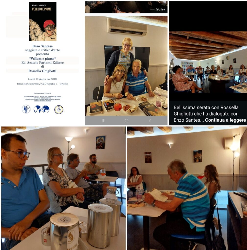 Con il patrocinio della FIDAPA BPW Trieste Storica, lunedì 16 giugno alle ore 18:00 presso il forno storico Sircelli, in via Azeglio, 1 a Trieste la Dott.ssa Rossella Ghigliotti, scrittrice, nonché affermata pittrice, ha presentato il suo romanzo “Velluto e piume” con l’intervento critico di Enzo Santese, poeta e saggista. Il romanzo si muove tra il lungomare e le calli di Muggia, “un buon posto in cui crescere i figli, dal quale le persone di mezza età speravano di andarsene e nel quale i vecchi desideravano tornare” e una Trieste che regala alla protagonista ventenne Ana, alle prese con il proprio passato e quello della sua famiglia, “l’illusione di appartenere a qualcosa di più significativo”. Ana è figlia di Caterina e Marcello, due ragazzi intrappolati dal loro stesso, reciproco, desiderio. Allora non resta loro che cercare la libertà, ognuno a modo proprio, ricerca che influirà pesantemente sulla vita di Ana e dei nonni materni Mentana e Aurelio. Eppure, forse, oltre ogni confine, fisico e spirituale, esiste una possibilità di riconciliazione. Ghigliotti alterna momenti di fascinazione e crudo realismo in una narrazione immersiva, in cui i personaggi sono ben delineati, senza giudicare mai, accompagnando il lettore fino alla fine, in un viaggio introspettivo. Ma è davvero la fine? O un nuovo inizio?