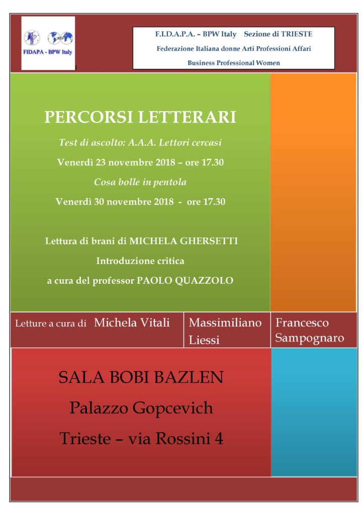 Questo Percorso Letterario si inserisce nei Percorsi Artistici che sono stati proposti dalla sezione storica TRIESTE della F.I.D.A.P.A. BPW Italy e che hanno visto le nostre artiste esporre a rotazione le loro opere mensilmente . Dato il successo di pubblico ed il riscontro la collettiva delle nostre artiste è destinata a continuare nel tempo.