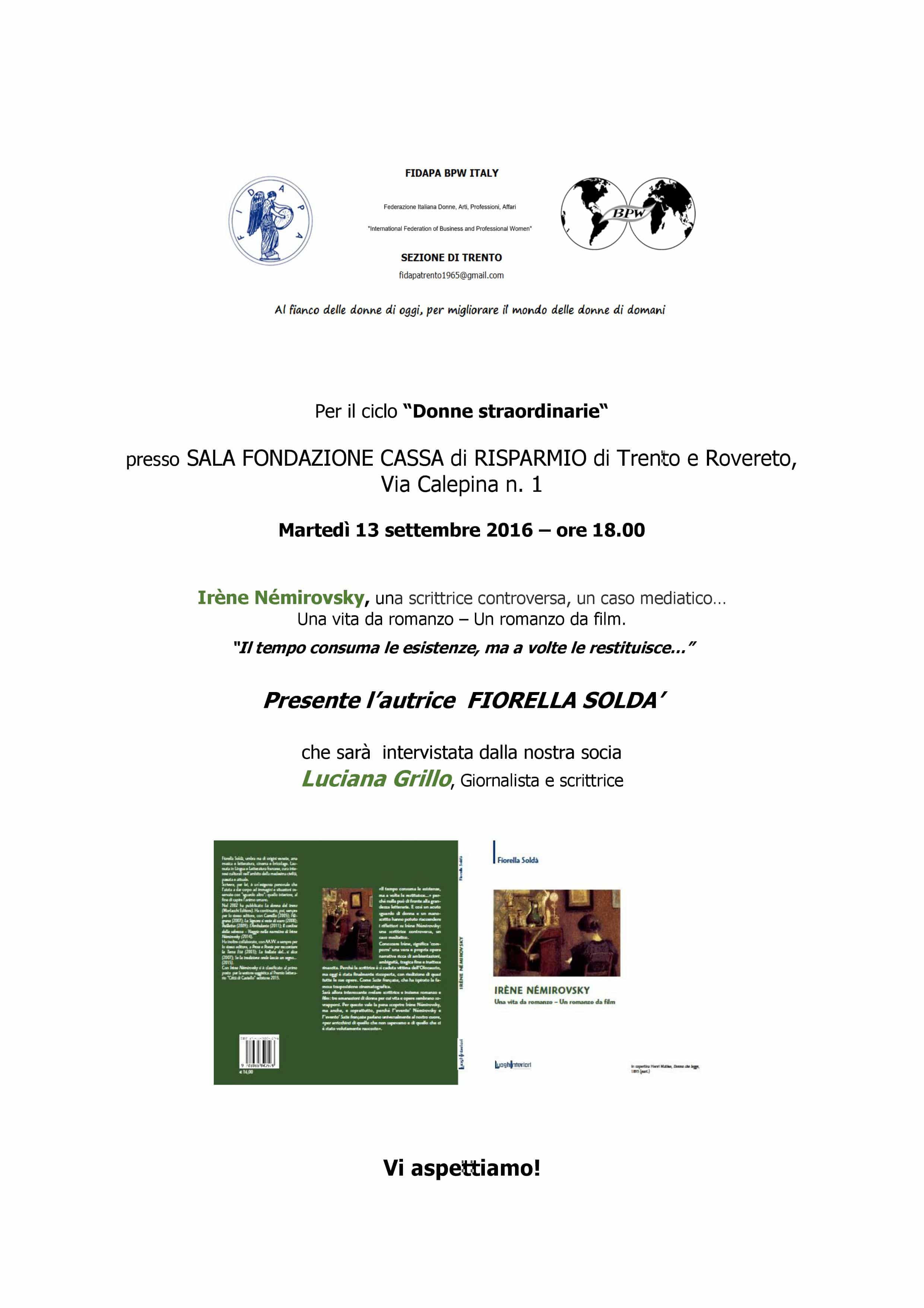 FIDAPA SEZIONE DI TRENTO inaugura la stagione 2016/2017 con un evento culturale, in linea con la propria mission che vuole promuovere i talenti femminili e le donne che hanno cambiato la storia. Per il ciclo “Donne straordinarie”, martedì 13 settembre 2016, presso la Sala della Fondazione Caritro, la nostra Associazione ha organizzato la presentazione del libro di Fiorella Soldà : Iréne Nèmirovsky “Una vita da romanzo, un romanzo da film”. La nostra Socia Luciana Grillo, Giornalista e Scrittrice ha intervistato con molta verve e professionalità l’autrice del libro, la quale ha raccontato il pensiero e l’intensa vita della Nèmirovsky: controversa scrittrice di origine ucraina, ma francese di adozione.