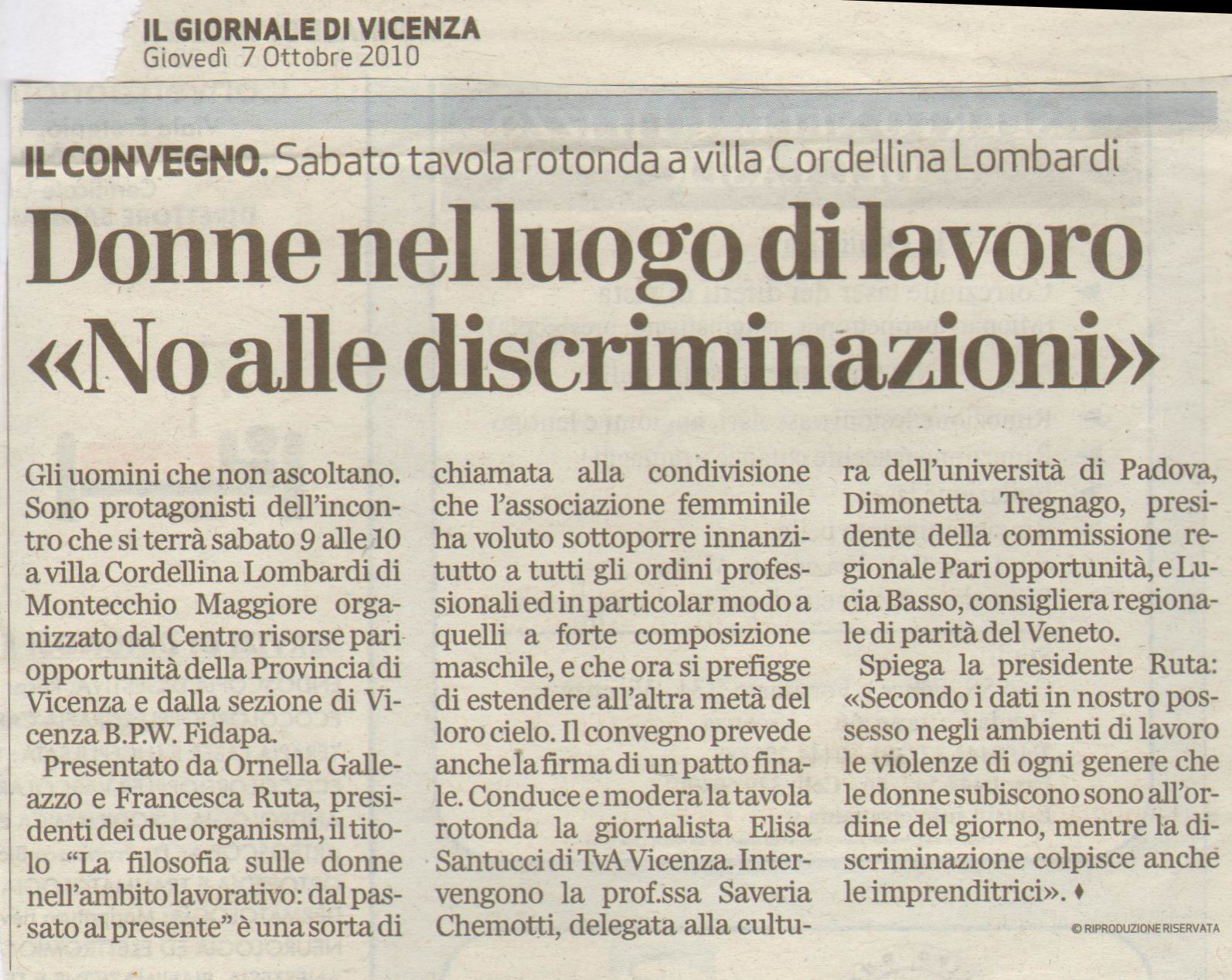 Al progetto che ha preso avvio il 9 Ottobre 2010 è seguita una conferenza storico–filosofica sull’evoluzione della partecipazione della donna nel mondo del lavoro. Si è cercato di capire quali siano state le tappe fondamentali che hanno segnato, nella storia, il superamento di pregiudizi e concetti che hanno ostacolato l’inserimento femminile negli ambiti lavorativi. La conferenza era rivolta agli Ordini e Collegi professionali che avevano aderito alla prima fase del progetto: “Quello che non ascoltano mai…” tenutosi il 9 ottobre 2010 a Ville Cordellina (VI), che aveva visto sottoscrivere una dichiarazione di intenti da parte dei rappresentanti degli ordini professionali che avevano aderito.