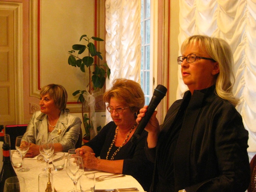 Festeggiatissima la presidente uscente Dott.ssa Leonilde Collauto, che ha ricevuto dalle mani della vicepresidente Franca Maschietto la spilla che la Sezione consegna ad ogni presidente a fine mandato, quale segno di gratitudine per il lavoro svolto. La spilla raffigura il logo della FIDAPA, la dea Afrodite che si specchia nello scudo