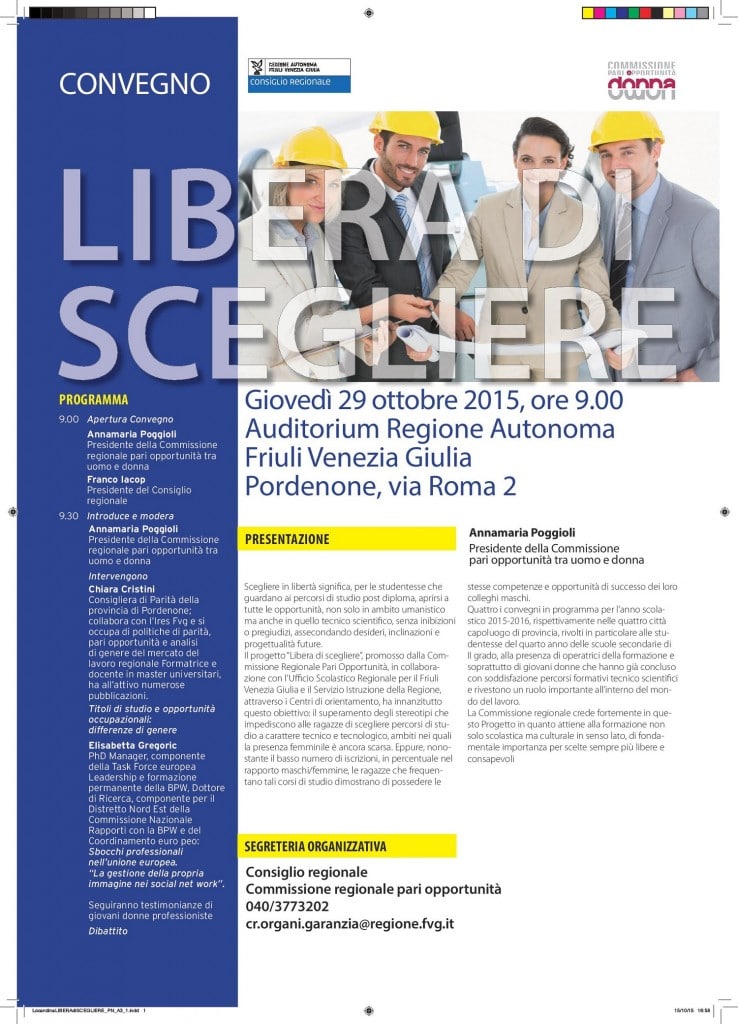 Il progetto “Libera di scegliere”, promosso dalla Commissione Regionale Pari Opportunità, in collaborazione con l’Ufficio Scolastico Regionale per il Friuli Venezia Giulia e il Servizio Istruzione della Regione, attraverso i Centri di orientamento, ha innanzitutto questo obiettivo: il superamento degli stereotipi che impediscono alle ragazze di scegliere percorsi di studio a carattere tecnico e tecnologico, ambiti nei quali la presenza femminile è ancora scarsa. Eppure, nonostante il basso numero di iscrizioni, in percentuale nel rapporto maschi/femmine, le ragazze che frequentano tali corsi di studio dimostrano di possedere le stesse competenze e opportunità di successo dei loro colleghi maschi.