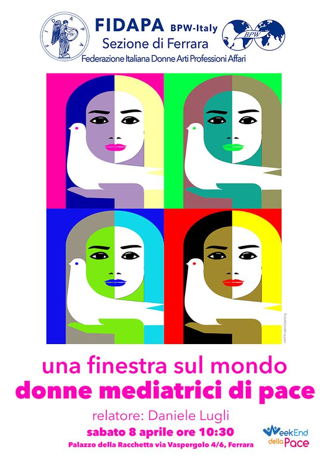 Partner del Weekend della Pace, (iniziativa del Lions Club Ferrara Estense, che coinvolge tutta la città in una serie di eventi di carattere didattico, culturale, ricreativo, sociale e ludico) la Sezione Fidapa BPW Italy di Ferrara ha organizzato sabato 8 aprile alle 10,30 l’incontro dibattito “Una finestra sul mondo: donne mediatrici di pace” tenuto dall’ Avvocato Daniele Lugli, Fondatore del Movimento Non Violento di Ferrara.