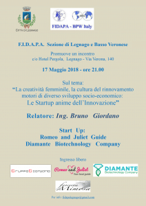 F. I.D.A.P.A. Sezione di Legnago e Basso Veronese, con il patrocinio del Comune di Legnago, promuove un incontro giovedì 17 Maggio 2018 alle ore 21.00 presso l’Hotel Pergola a Legnago con l’ Ing. Bruno Giordano – Start Up: Romeo and Juliet | Diamante Biotechnology company