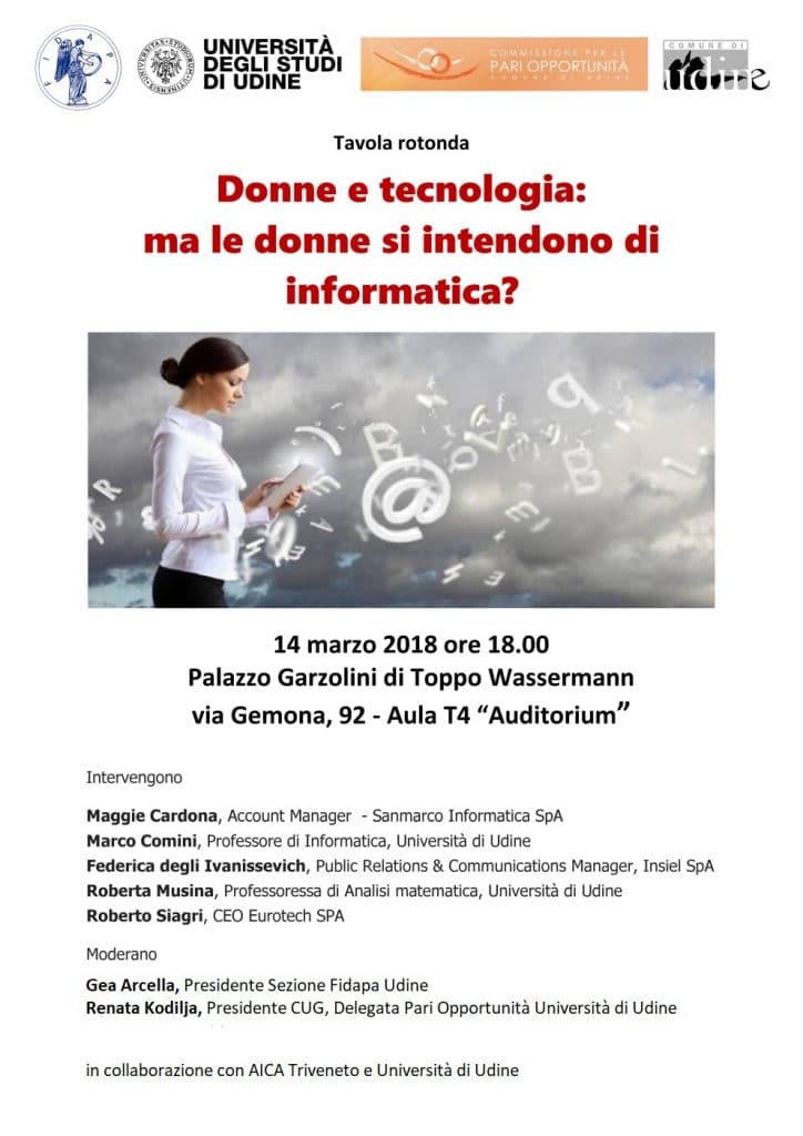 La tavola rotonda, organizzata nell’ambito della rassegna Calendidonna, promossa dal Comune di Udine, in collaborazione con AICA Triveneto e Università di Udine, è stata un’ occasione per discutere sul ruolo della donna relativamente alle tecnologie informatiche e telematiche, anche in relazione alle recenti polemiche sulla incapacità “biologica” della donna ad occuparsi di informatica (v. il caso Google) in contraddittorio con un uomo, il tutto in occasione della festa della donna e come forma di promozione alla diffusione del sapere scientifico tra le studentesse di genere femminile.