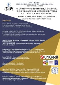 Sabato 24 Marzo 2018, alle ore 10:00, al Circolo Ufficiali di Castelvecchio, si svolgerà il convegno “La creatività femminile, la cultura dell’innovazione motori di diverso sviluppo socio-economico”, organizzato dalla FIDAPA BPW Italy – Sezione di Verona Centro. Saranno presenti la Presidenze di Sezione Anna Giovannoni, la Vice Presidente Nazionale Cettina Olivieri e la Vice Presidente DistrettualeMariapina Maglione.