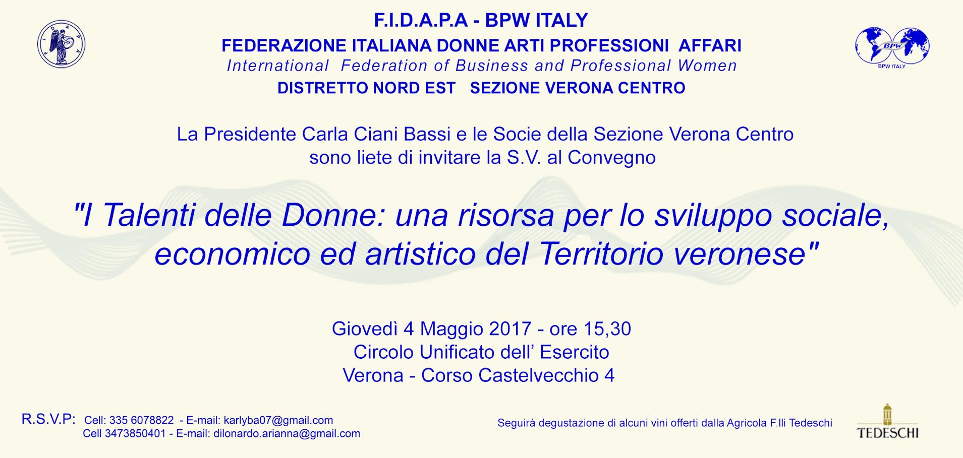 locandina convegno Talenti-page-001 (4)“Quando ho iniziato a pensare a questo evento non  sapevo se sarei riuscita a trovare storie  importanti e uniche nel loro genere: vicende da raccontare, diverse, ma tutte testimonianze di  impegno, coraggio e capacità, storie di donne interpreti eccellenti della vita sociale, produttiva ed artistica del mondo veronese. Ho chiesto loro di raccontarsi, di creare  una rete virtuosa. Poi le diverse personalità mi sono venute incontro, felici di poter narrare la loro storia, senza retorica, con semplicità, perchè possa essere stimolo, modello, esempio soprattutto per le giovani che avranno la fortuna di ascoltarla “. Così scrive la Presidente della Sezione Verona Centro, Carla Ciani Bassi, organizzatrice del Convegno. Sarà presente la Vicepresidente nazionale Caterina Mazzella, mentre sentiremo la mancanza della vicepresidente distrettuale Chicca Coccitto, impegnata in un altro evento culturale”.