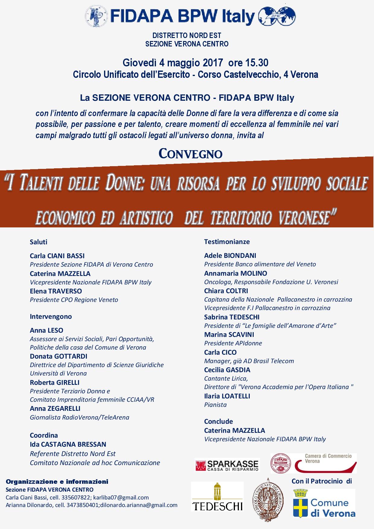 Alcune  eccellenze femminili veronesi saranno presentate in un interessante Convegno “I talenti delle donne : una risorsa per lo sviluppo sociale economico ed artistico del territorio veronese”, che si terrà il 4 maggio prossimo presso il Circolo Unificato dell’Esercito di Verona.