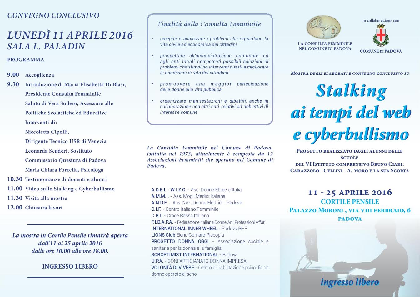 Struttura dell’intervento Sono stati effettuati 3 incontri di 2 ore ciascuno dove si sono messe in evidenza le finalità dell’intervento tramite la creazione di messaggi, slogan, poesie video e quant’altro di artistico, da parte degli alunni, sullo stalking e cyberbullismo finalizzati poi alla mostra delle opere presso Palazzo Moroni. L’ultimo incontro è stato un lavoro di orientamento sulla definizione di identità sociale e virtuale mettendo in evidenza il sottile confine tra vita “online” e “offline” e quanto questo aspetto possa influenzare il proprio comportamento reale. Le attività di gruppo hanno lavorato sulla percezione dei ragazzi, sulle caratteristiche della rete come diffusione veloce e incontrollabile delle informazioni e sulla responsabilità del proprio agire in relazione ai social network,alla consapevolezza del danno che si può arrecare. Sono state inoltre proposte attività di sensibilizzazione sul vissuto della vittima, con testimonianze o interventi da parte di istituzioni che si occupano del fenomeno.(Polizia di Stato e Consulta Femminile e altre associazioni). Questi interventi hanno avuto l’obiettivo di stimolare riflessioni personali da parte degli studenti al fine di sensibilizzare e creare una coscienza comune per avvicinarli alle istituzioni.