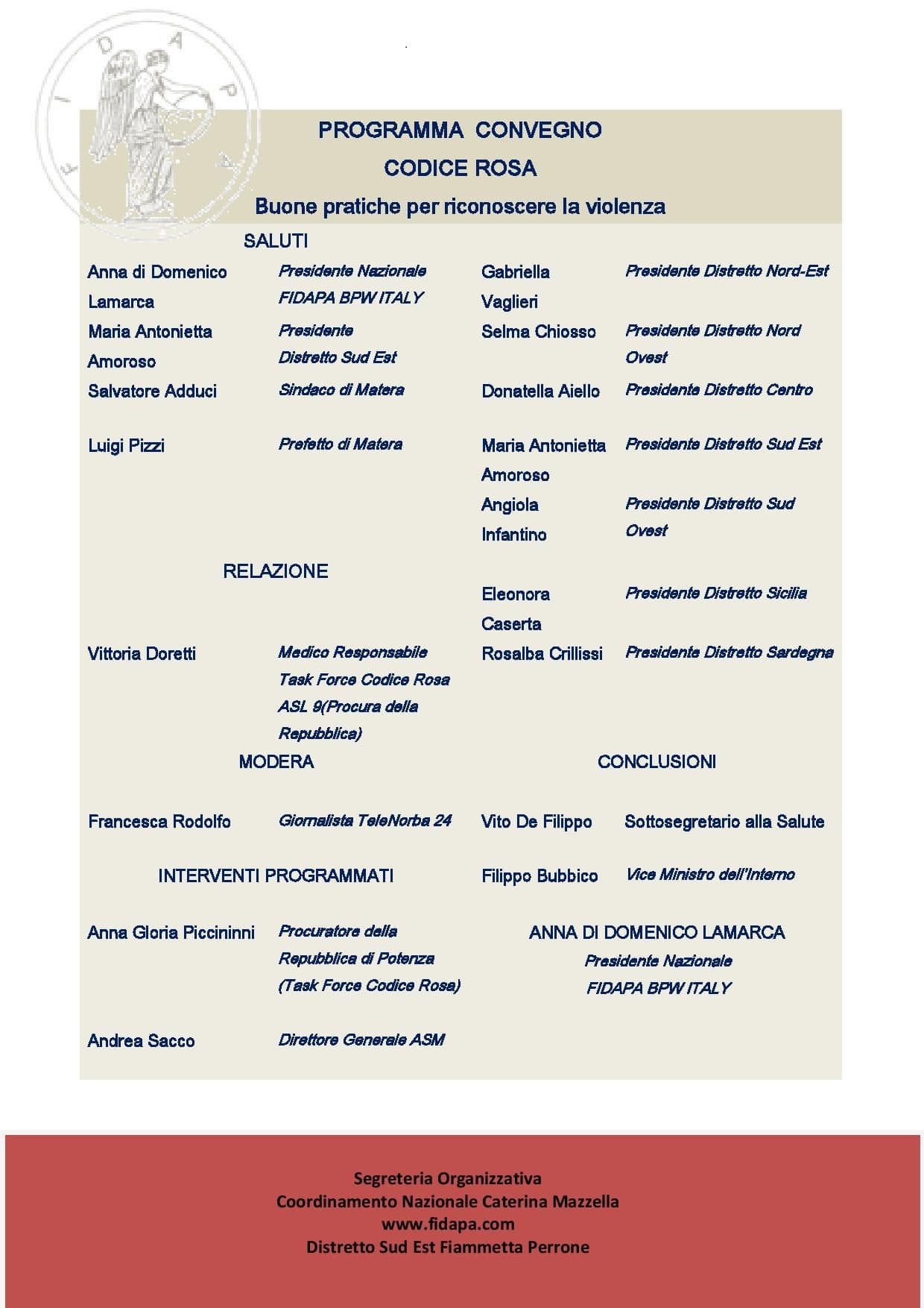 Ha presieduto i lavori la presidente nazionale Anna Lamarca. Sono intervenute le presidenti dei distretti nazionali e autorità politiche e istituzionali.  Il codice rosa identifica un percorso di accesso al pronto soccorso riservato a tutte le vittime di violenza, senza distinzione di genere o età, quindi non solo donne, ma anche bambini, anziani, disabili, immigrati e omosessuali, persone che, a causa della loro condizione di fragilità, più facilmente possono trovarsi in una situazione di debolezza e vulnerabilità e quindi diventare vittime di violenza.